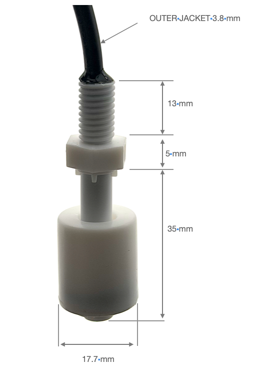PP float is our smallest float switch. Fits in tight spaces like 3/4″ drum bungs. Retaining peg is PP. Uses two pin-shaped magnets are pin shaped that are sealed with PP. Not reversible.