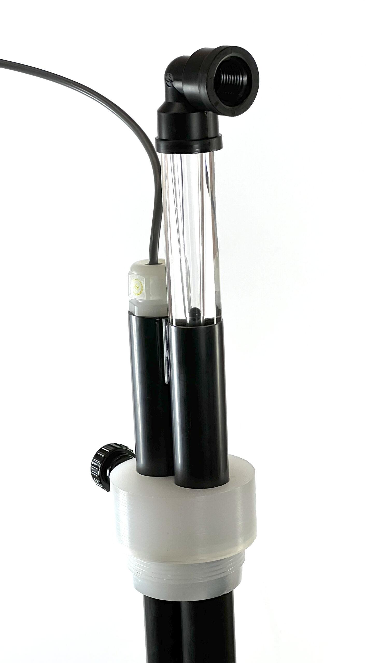 This customer wanted a drumalarm without the electronics enclosure – just a connection to their PLC. The feed pipe is the same as our standard units with flowmeter but the electronics enclosure is eliminated which provides only a contact close (or open) from the reversible float switch.