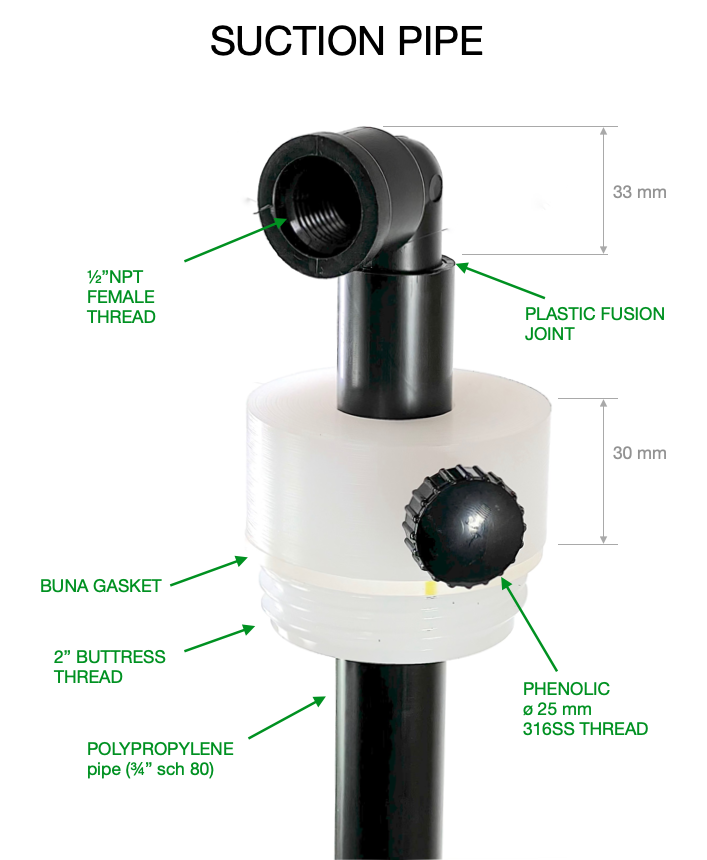 We offer different suction pipes built specifically for the job of drawing chemicals from drums. Choice of 2″NPT thread (most common) or 2″ Buttress thread (the coarse thread which requires fewer turns to screw in) Further discussion on drum threads here.