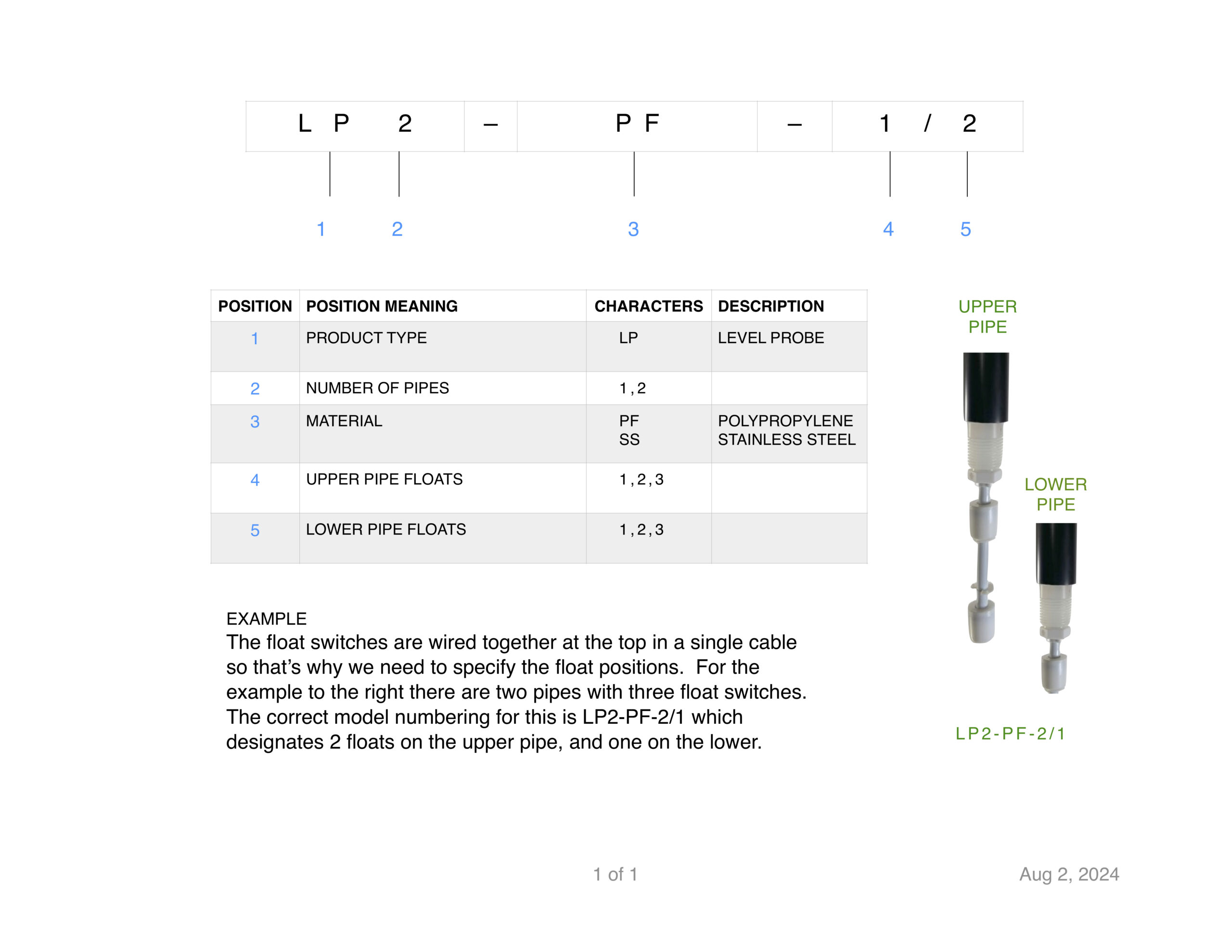 LP-KK (Kynar) models are made from Kynar pipe, Kynar float, and PVDF cable seal. Only one float switch per pipe is possible.