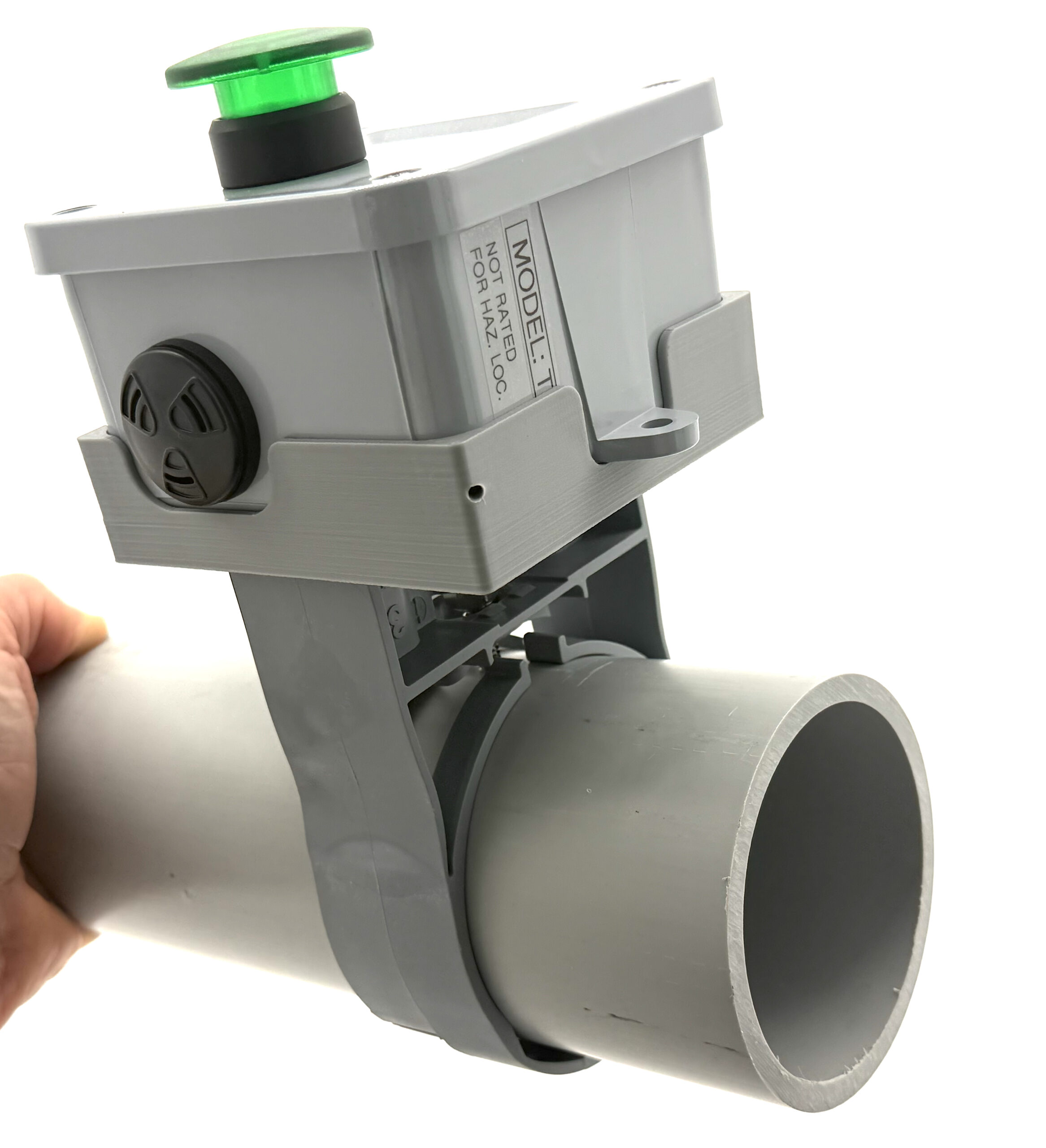 This customer had no place to mount the timers on their plating line. They did however have a 3″ diameter air duct running the entire length of the plating line. This was the perfect location to mount our timers! Therefore we utilized a pipe clamp to mount the timers in a 3D printed “cradle”. The timers snap into the cradle securely.
