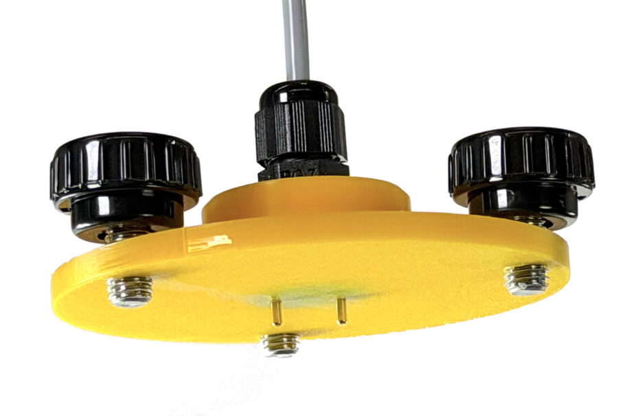 This conductivity alarm will detect leaks on floors. Sends the signal to an electronics enclosure (not shown) that will then communicate a text message if there is a flood. Features adjustable screws to set the height to ignore incidental condensation.