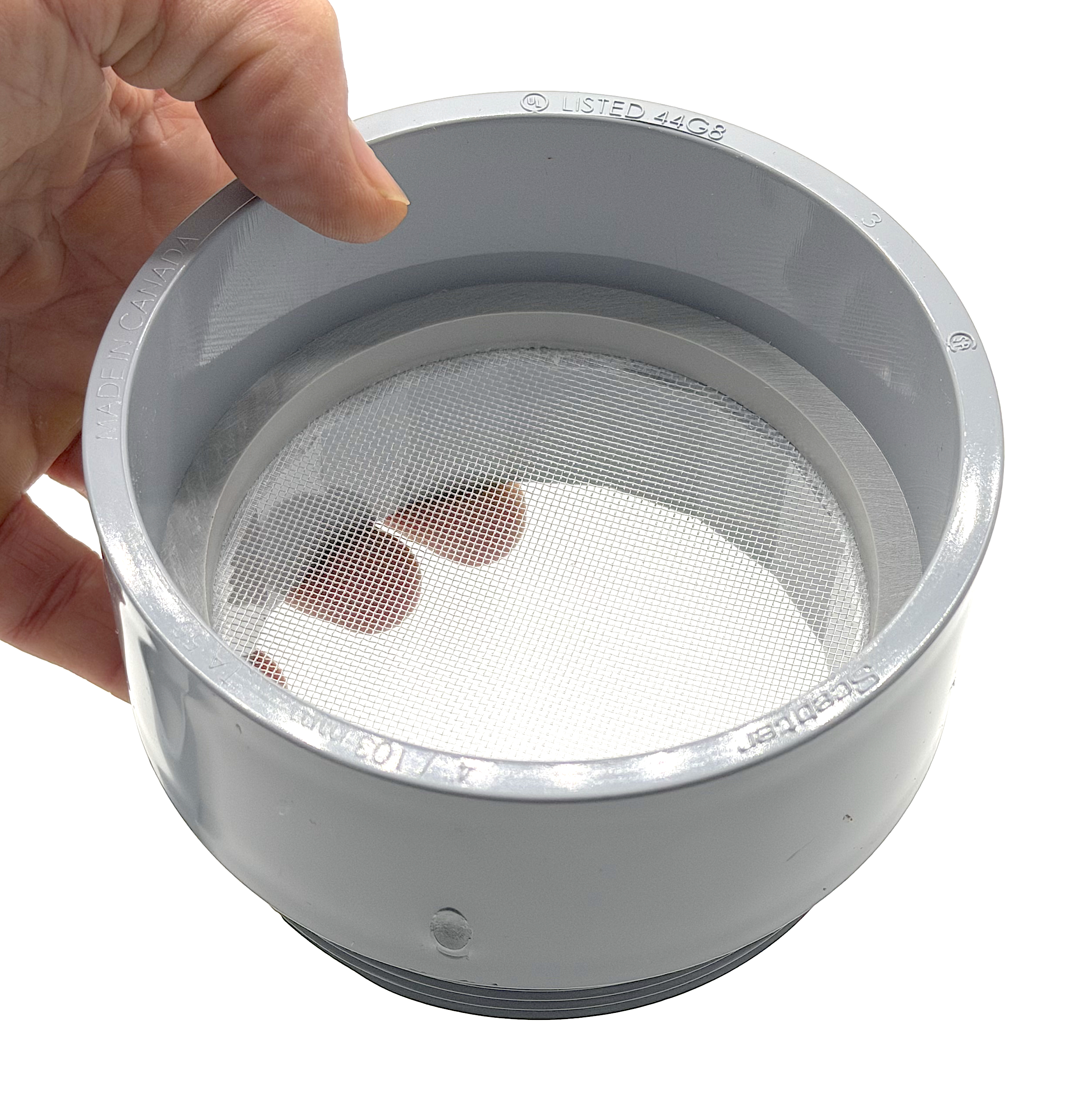 VENT CAP WITH FINE SCREEN. Due to a local ordinance this customer wanted an 8 inch vent cap with 31 mesh screen (600 micron) instead of the perforated PVC sheet.